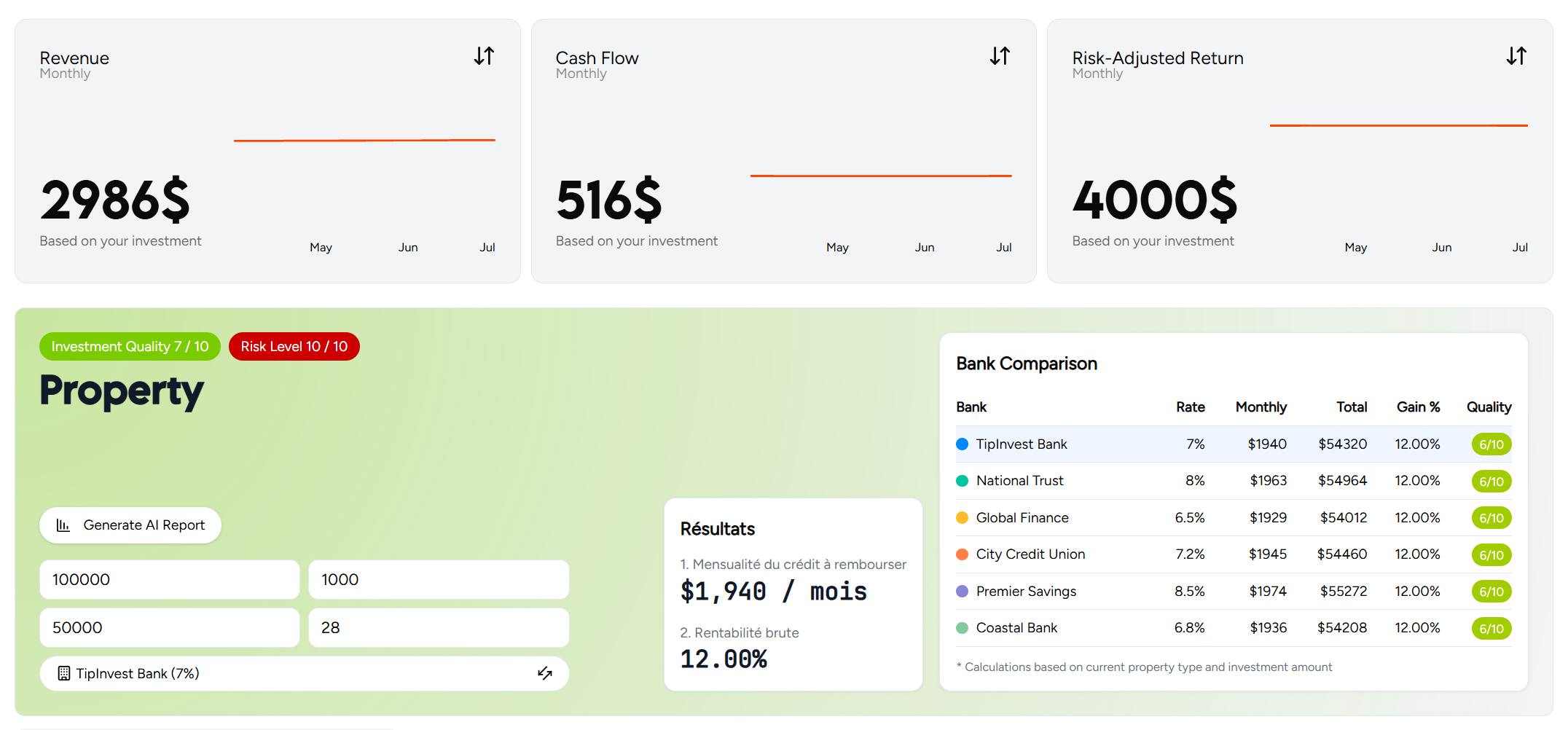 Intelligence Artificielle : Notre algorithme analyse en temps réel les tendances du marché et vous recommande les meilleures opportunités d’investissement en fonction de votre profil et de vos objectifs. Simulations financières avancées : Prévoyez la rentabilité, optimisez votre fiscalité et prenez des décisions stratégiques basées sur des données fiables.